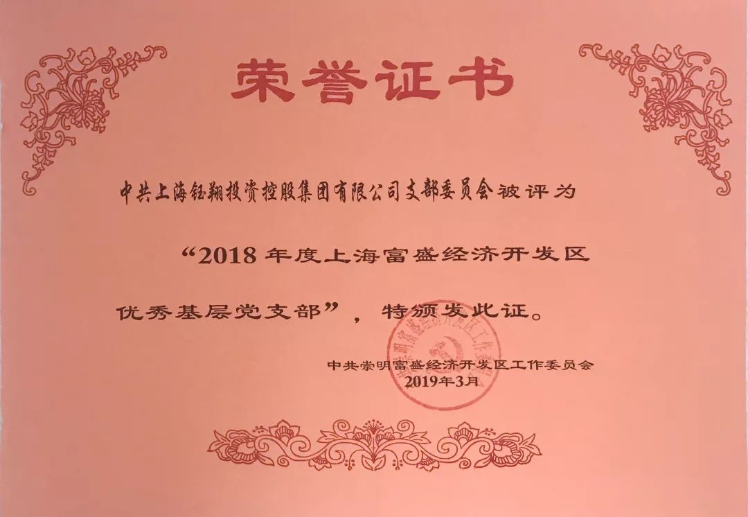 近日,集團黨支部被評為2018年度上海富盛經濟開發區優秀基層黨支部。