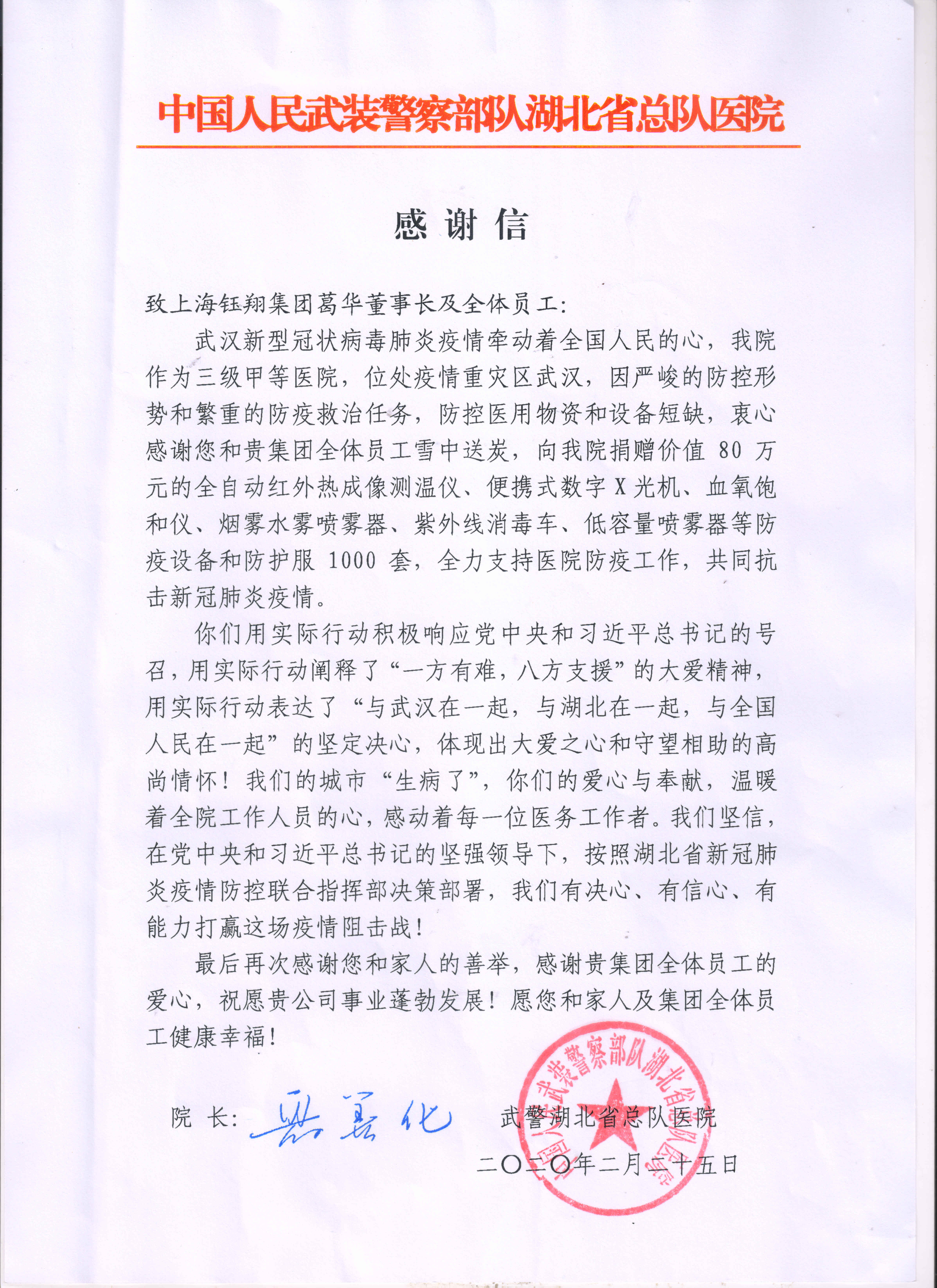 在收到此批捐贈物資后,武警湖北省總隊醫(yī)院第一時間向鈺翔控股集團發(fā)來了感謝信。