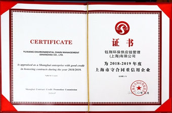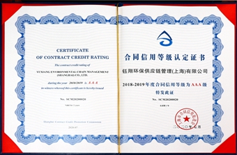 日前,鈺翔控股集團旗下鈺翔環保供應鏈管理(上海)有限公司、上海久源經貿發展有限公司被評為“2018-2019年度上海市守合同重信用企業”,并榮獲AAA級合同信用等級認定。