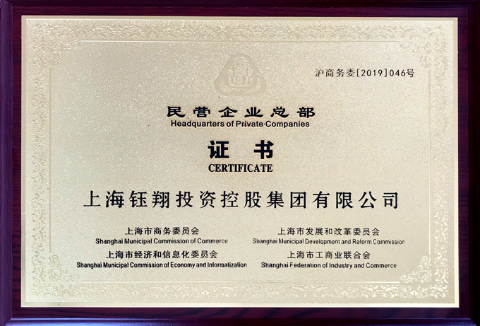 上海市商務(wù)委員會(huì)、上海市發(fā)展和改革委員會(huì)、上海市經(jīng)濟(jì)和信息化委員會(huì)、上海市工商業(yè)聯(lián)合會(huì)等部門聯(lián)合認(rèn)定集團(tuán)為上海市民營(yíng)企業(yè)總部,并已在近期向我集團(tuán)頒發(fā)證書(shū)。