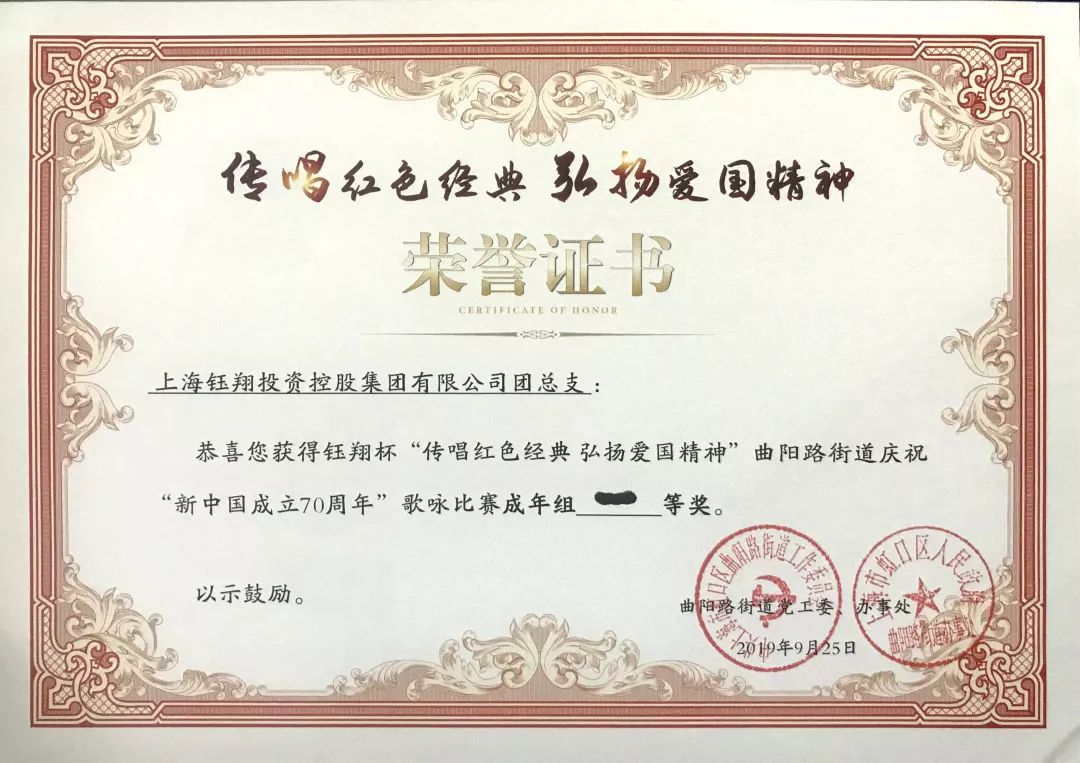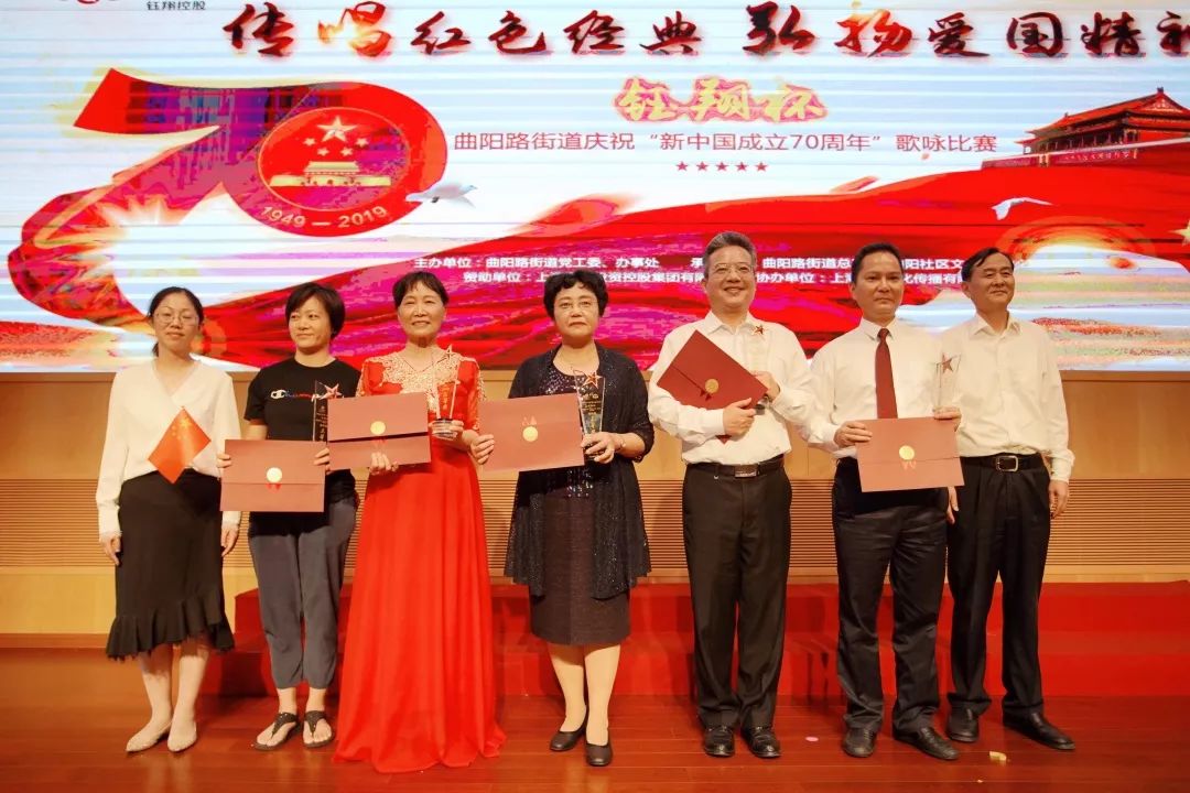 9月25日,傳唱紅色經典、弘揚愛國精神——“鈺翔杯”曲陽路街道慶?!靶轮袊闪?0周年”歌詠比賽決賽圓滿落下帷幕。集團團總支和工會兩支隊伍進入決賽,決賽中集團團總支演唱的《我愛你中國》榮獲一等獎,集團工會演唱的《中國人》榮獲三等獎,取得了優異的成績。